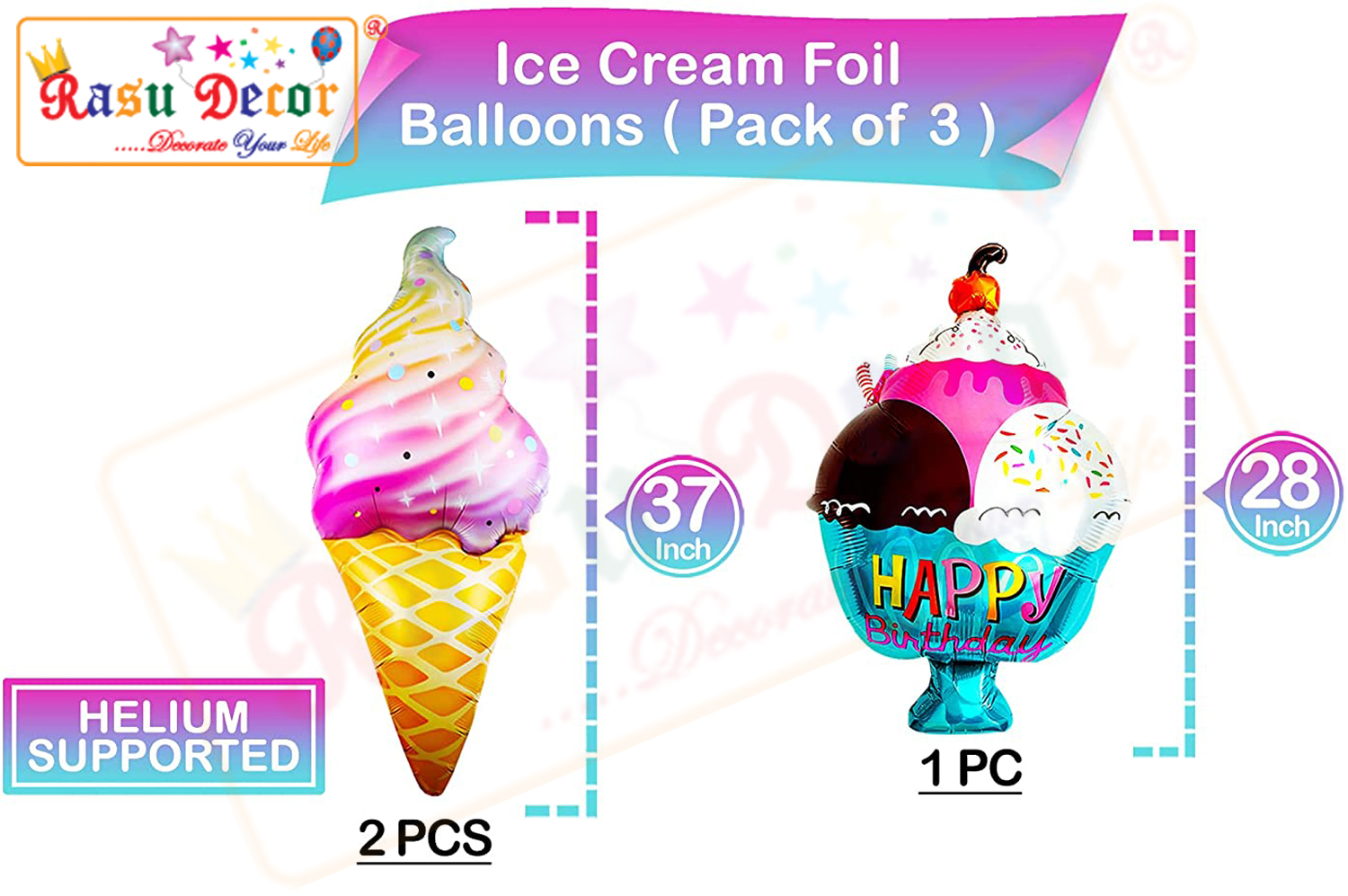 • 🍦🍧 RasuDécor REUSABLE ICE CREAM PARTY SUPPLIES | STURDY SWEET ICE CREAM BALLOONS DECORATIONS : This colorful ice cream balloons for birthday party will add the appealing and scrumptious add-on to the ice cream decorations for birthday party or sweet one ice cream birthday party decorations . This ice cream foil balloon are made of sturdy grade ‘A’ quality material and can stand the long-hour display and reused this ice cream cone balloon again.